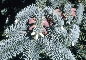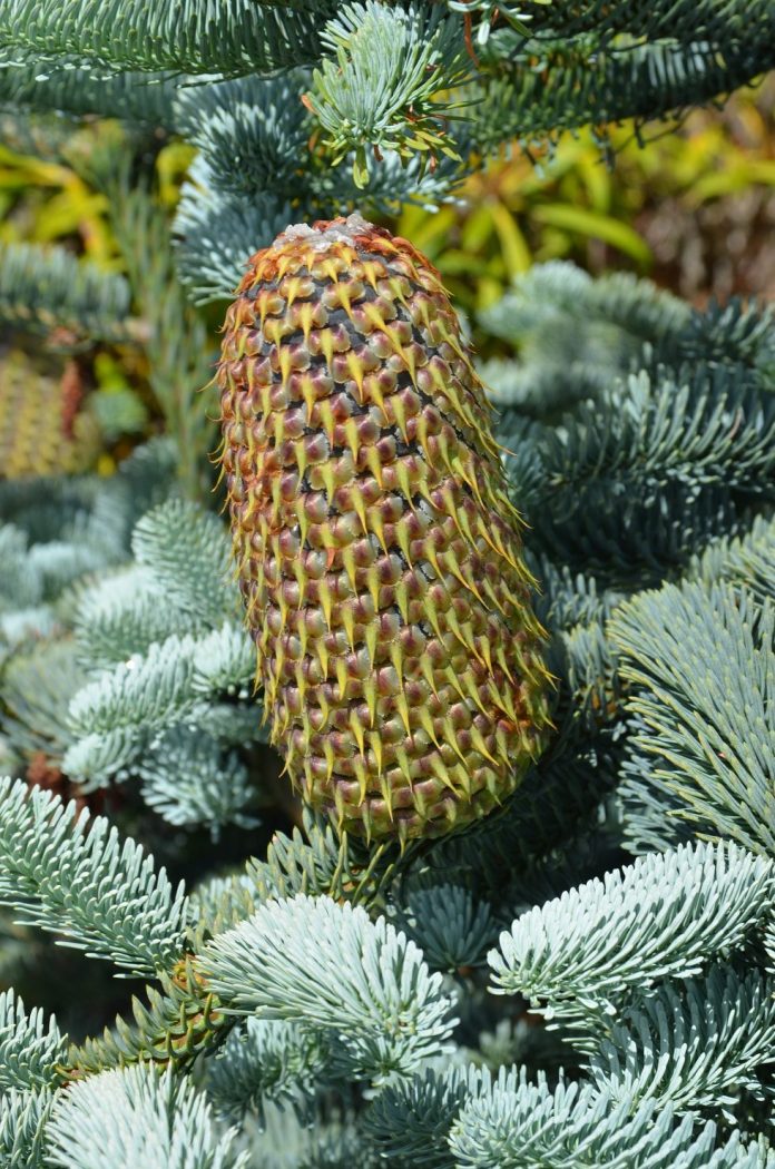 Hannblomsterstandene er dekorative med sin sterke rødfarge før blomstring. De er mest tallrike i den nedre delen av krona, mens hunnblomstene i kongleanlegget er gule til rødlige og mindre synlige fordi de som oftest sitter på de øvre greinkransene. Konglene er store, gjerne mellom 10 og 25 cm lange, som regel sylindriske og 7-8 cm tykke. De har tilbakebøyde dekkskjell som stikker utenfor selve konglen og nærmest dekker tuppen av kongleskjellene. Konglene er først grønne, men de blir purpurbrune mot modning. Kongler kan forekomme også på ganske unge trær. De tunge konglene kan av og til føre til at sidekvister brekker og blir ødelagt.