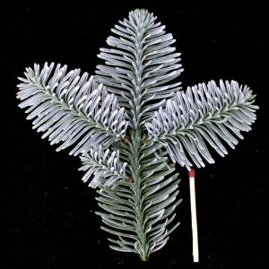 Barken er glatt, sølvgrå og med harpikskuler på unge trær. Seinere blir den brun og dypt furet. Kvisten er rødbrun og behåret, men sett ovenfra er den nesten helt skjult av nålene. Vinterknoppene er rødbrune, egg- til kuleformete og med harpiks. Nålene er blå- til grågrønne, butte eller sjelden utrandet, det vil si med et lite hakk inn i spissen. Hver nål har to tydelige blågrønne til grålige spalteåpningsbånd på undersiden og enkelte rader med spalteåpninger på oversiden. På kvistens overside er nålene 1-1,5 cm lange og tettsittende. Basis er tiltrykt og peker framover langs kvisten, men nålene bøyer seg opp mot tuppen, slik at de danner en C-form. På siden er nålene 2-3,5 cm lange. De er først rettet framover langs kvisten og deretter bøyd ut til siden og framover. Slik får de en svak S-form.