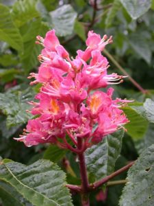 Aesculus x carnea – hestekastanje med rosarøde blomster