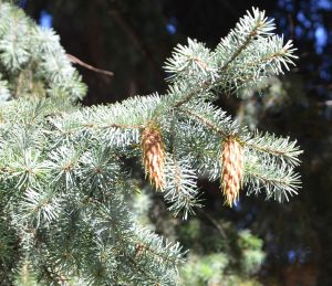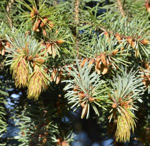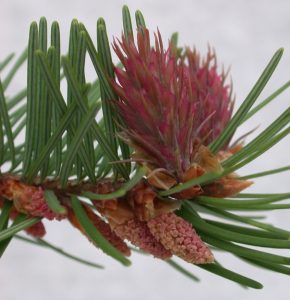Hannblomsterstandene er 8-20 mm lange, avlange og gule eller rosa. Kongleanleggene er ved pollinering 10-25 mm lange og grønne til rosa. De har godt synlige, treflikete dekkskjell. Modne kongler er 6-12 cm lange og hengende. Hver kongle har et om lag 1 cm langt skaft og modner etter fem til syv måneder. Da faller de hele av, som hos gran. De særpregete, treflikete dekkskjellene stikker langt utenfor de avrundete kongleskjellene. Det sitter to frø på hvert kongleskjell. De er 7-12 mm lange, lysebrune til oransje, uten harpiksblærer, men med en 5-15 mm lang frøvinge. Frøplantene har seks til tolv frøblader.