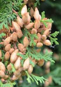 Konglene hos tuja er eggformete, lysebrune og sitter gjerne tett sammen. Foto: Ole Billing Hansen