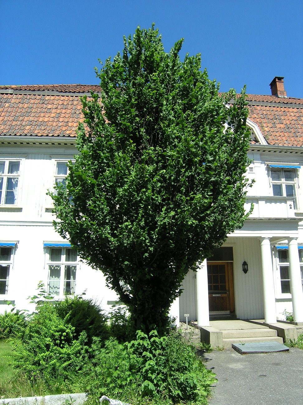 Úlmus glábra ‘Exoniensis’ blir vanligvis formklipt til en bred søyle, eller krona får kjeglefasong. Foto fra Fredrikstad i 2007.