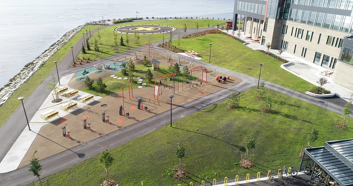 I park & anlegg 8/2020 presenterer landskapsarkitekt MNLA Siri Alette Aurstad i Norconsult prosjektet, som er en storsatsing i regi av Steinkjer kommune. Inntrøndelag helse- og beredskapshus er distriktsmedisinsk senter og har fastlegekontorer, ambulanse og legevakt samt rehabiliteringstjeneste – alt samlet på ett sted. I det fem etasjer høye felles bygget holder også Familiens hus, barnevern, brannvesen og sivilforsvarets beredskapsavdeling til. Bygget sto ferdig i 2019 og er omgitt av et stort utomhusanlegg som er blitt svært populært.