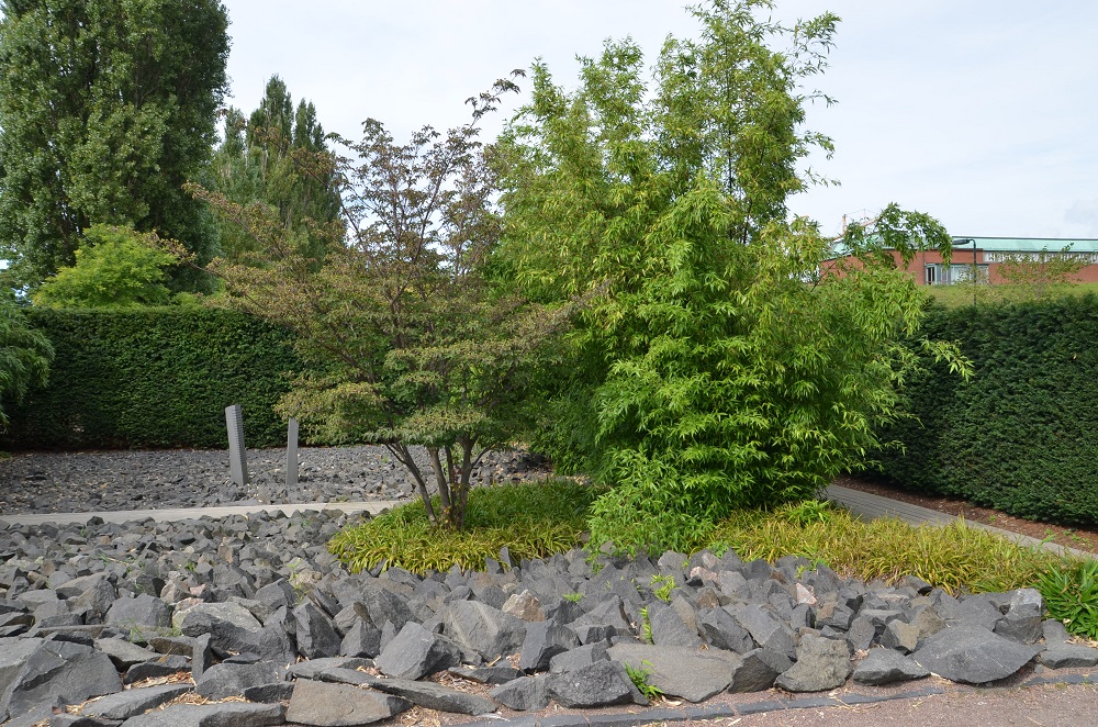 En av temahagene er designet av slottsgartner John Taylor og anlagt som en japansk hage. Hagen er anlagt etter inspirasjon fra den zen-buddhistiske hagekunsten. Den er stramt oppbygd med relativt få elementer og et begrenset antall planteslag. Miljøet skal bidra til at besøkeren finner indre ro. De svarte steinene er lagt ut etter en gjennomtenkt plan, med gradvis minkende størrelse innover i hagen. Steinene er av bergarten diabas fra Boalt i Skåne og er en metafor for vann – en viktig del av konseptet. I hagen ligger det gangstier av plankebord av sibirsk lerk. Ifølge Taylor gir treverket rommet et modernistisk preg som samspiller med buddhismens meditative enkelhet.