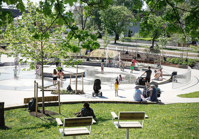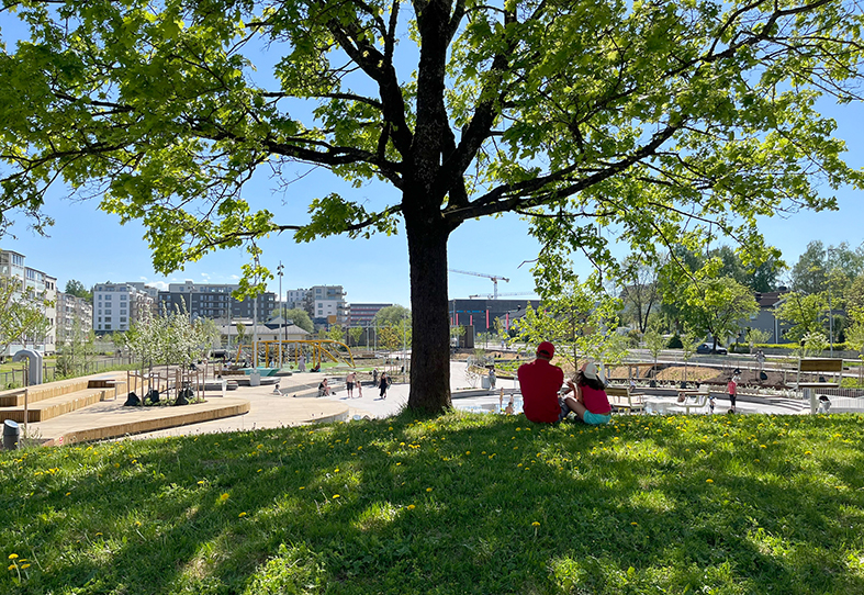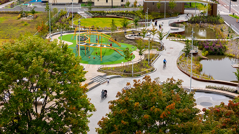 Parken har mange varierte oppholdssoner for rekreasjon og sosiale møter i grønne omgivelser, en spennende lekeplass, utsiktsplattform og et stort amfi. To dammer med vakre vannspeil og sildrende vann mellom, og frodige kantsoner for fugler og dyreliv gjør at naturen kommer tett på folk. En eksisterende grønn kolle med vakre lønnetrær er bevart som et tilbaketrukket sted for rekreasjon, med fin utsikt til liv og røre i hele parken.