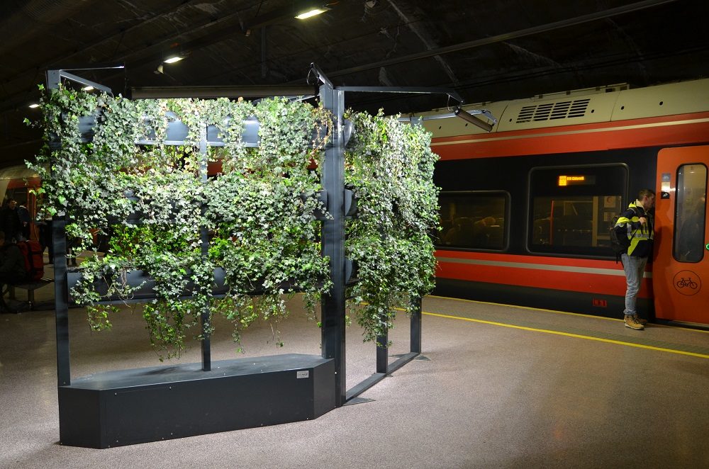 På Nationaltheatret stasjon prøver Biowall ut tre ulike typer av grønnplanten bergeføy (bergflette – Hedera helix). Luft med svevestøv blir trukket gjennom planteveggen når togene passerer, og noe av svevestøvet avsetter seg på bladene. Det renser luften, men støvet må vaskes av bladene jevnlig for at den levende veggen skal kunne klare seg videre.