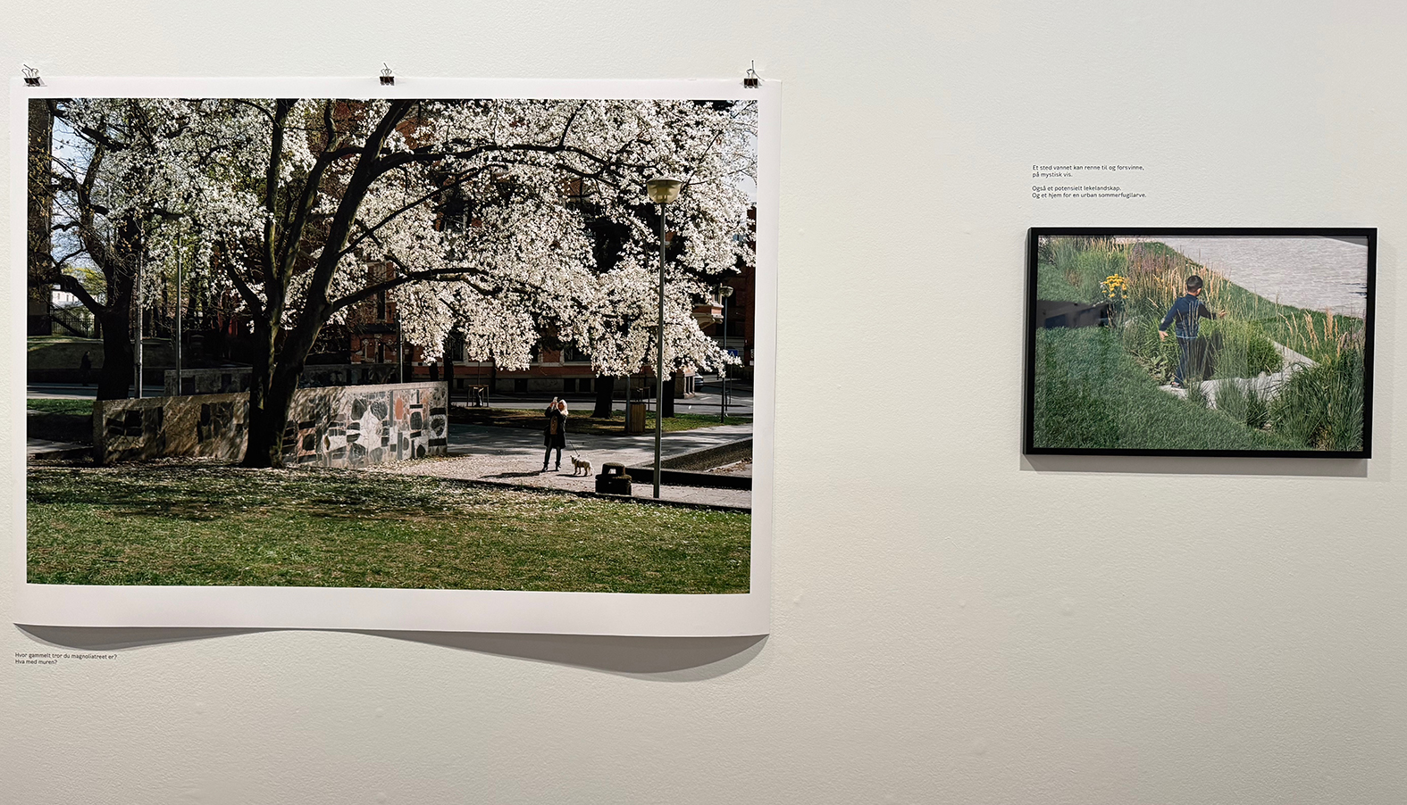 Ikke bare grønt Utstillingen er bygd opp rundt de tre hovedtemaene: byrom, trafikk og natur. – Vi ville vise at landskapsarkitektene har tatt valg om hvordan trærne står, vinkelen på benkene, farge i belegget og material og ikke kun plantefelt og grønt, alt for å forme opplevende våre, og derfor valgte vi å fokusere på andre ting enn det grønne i bildene vi viser frem. Fokuset er heller på mennesker, skala, materialer og bevegelse, sier Amir Hassanbeygi. De fleste prosjektene er fra Oslo, eller områdene rundt hovedstaden.