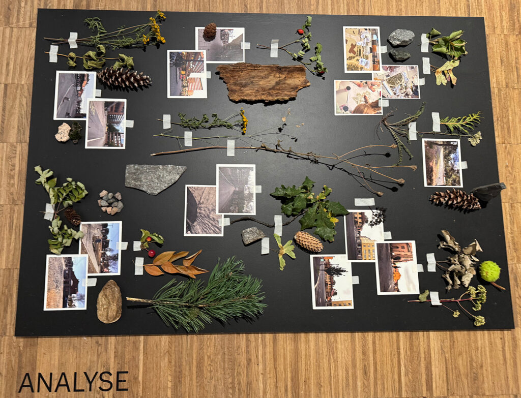 – Et av kriteriene fra Gamle Munch var at temaet for utstillingen skulle kretse rundt Tøyen og vise frem ting som er tilknyttet bydelen. Derfor har vi så langt som mulig holdt oss innenfor ring 2, og selvfølgelig har Tøyen torg fått en sentral plass, supplerer Stine Ingjer Eriksen. I arbeidet med utstillingen har Grindaker vært bevisst på at meningen var å presentere faget, ikke firmaet, og har valgt å vektlegge stemninger og opplevelser av uterom heller enn prosjekter. De har også inkludert prosjekter fra andre landskapsarkitekter i billedmaterialet. Fotografiene på veggene er alle tatt av fotografen Damian Heinish. De er inndelt i to kategorier: «vindu til hverdagslandskap», som plansjer hengt opp løst rett på veggen, og «hverdagslandskap som kunst», som innrammede bilder.