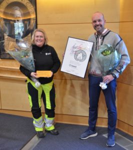 Glade mottakere av prisen Årets grønne park; ordfører i Sarpsborg Sindre Martinsen Evje og gartner Inger Hilde Jørgensen.