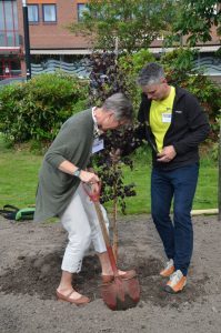 Ved den helt ferskt oppgraderte lekeplassen i Badeparken plantet Sandefjords parksjef Ingrid Marie Eidsten og styreleder i BPI, Jon Steinar Tufte, en rødbladet bjørk. Betula pubescens ‘Rubra’ er er finsk utvalg som er godt tilpasset nordlig klima. Sammen med andre nyplantinger i Badeparken gir det et flott tilskudd av spennende treslag i den sentrale byparken.