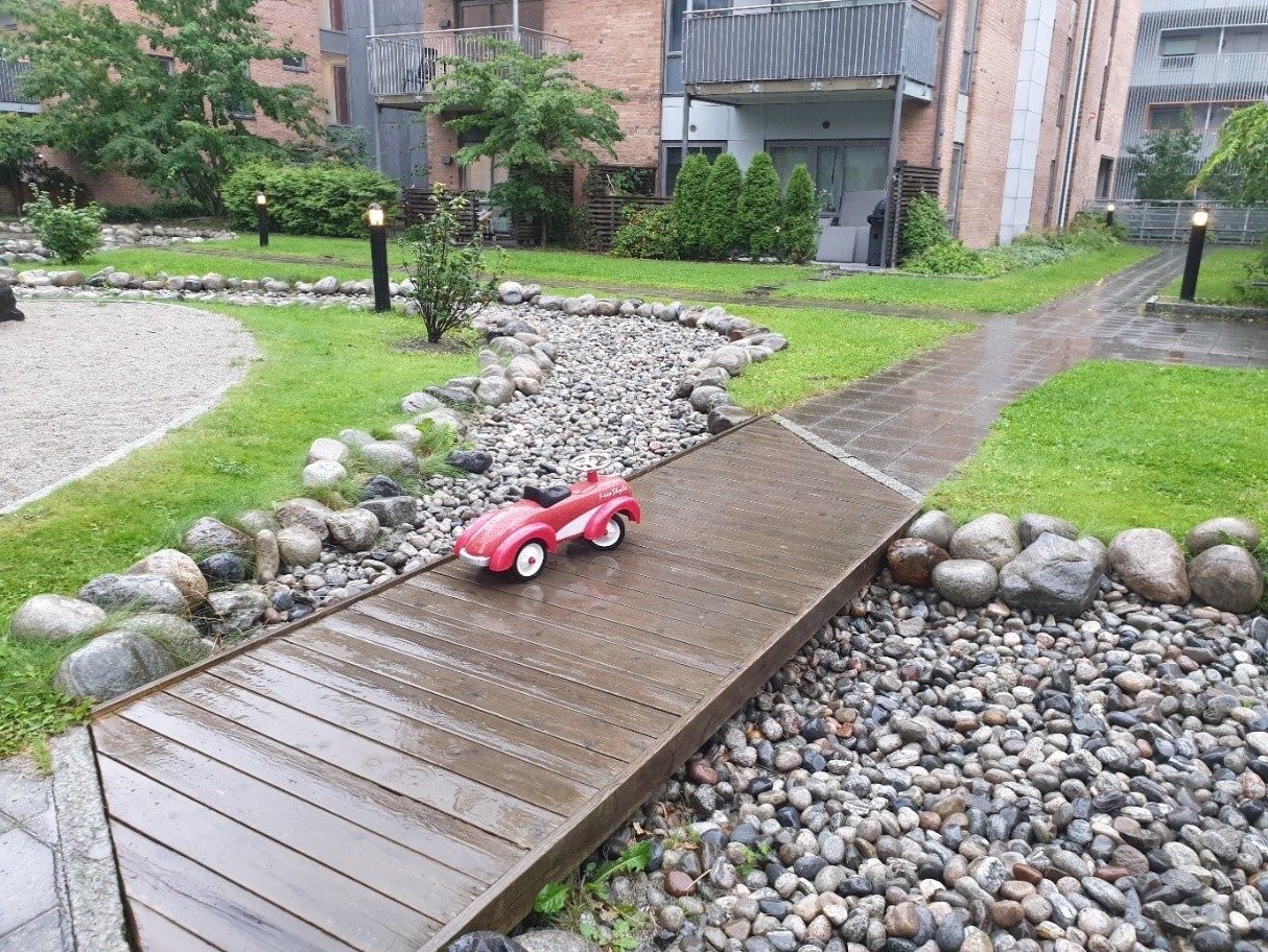 Turbinen borettslag. Anlegget er prosjektert av Open House (OBOS) med utførende anleggsgartner Tranby AS. På dette taket er den varierte materialbruken og frodige beplantningen med på å gi uterommet utforskningsmuligheter for barn. Innflytting i borettslaget var i 2007. Foto fra 2019: Anne Cecilie Oterkjær