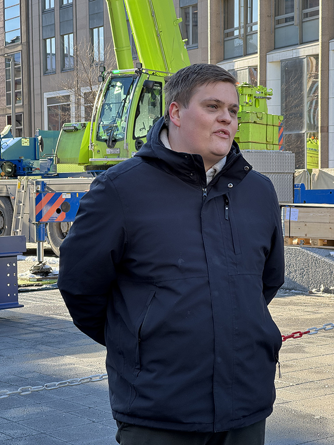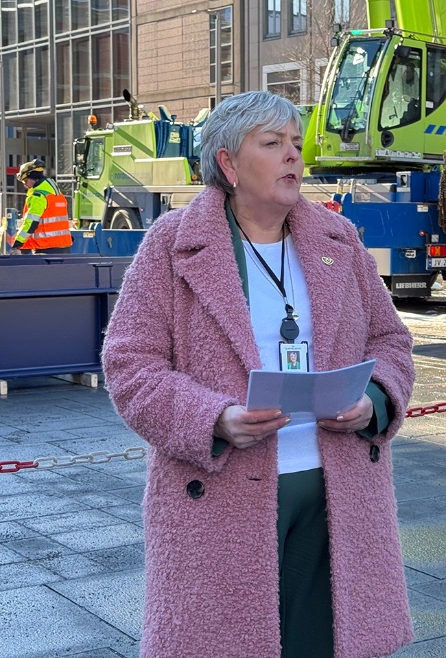 KOROs direktør Øystein Strand ønsket velkommen før han ga ordet til Karianne Tung. – Vi er først og fremst samlet i dag for å markere at fundamentet til minnesmerket nå er på plass. Samtidig så er vi også kommet dit at det bare er noen uker igjen til vi skal ta i bruk høyblokka som dere ser her. For gjenreisninga av regjeringsportalet, det er ikke bare et byggeprosjekt. Det er en historisk gjenoppbygging av et sentralt symbol på demokratiet vårt, sa Tung.