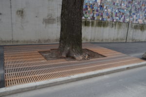 Almetreet har fått spesielt tilpasset tregruberist i cortenstål, som er fritt for rust der fotgjengere og syklister passerer. Foto: Ole Billing Hansen