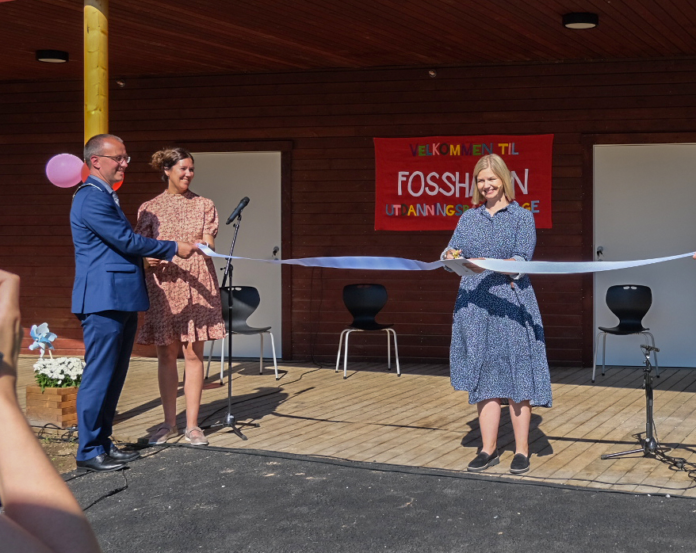 Kunnskaps- og integreringsminister Guri Melby klippet snoren under åpningen av Fosshagen Utdanningsbarnehage i Sogndal 10. august. Barnehagen er tegnet av Fortunen Arkitektur i Bergen, og Sandvik Play har vært med på utforming og bygging av lekearealene.