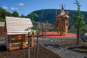 Alle lekeapparatene er levert av Sandvik Play. Firmaet var representert under åpningen og mottok blomster fra ordfører Arnstein Menes. Alle lekeapparatene er bygd av robiniavirke. Trevirket av robinia er hardt og nærmest vedlikeholdsfritt. Lekeapparater i robinia er dermed et miljøvennlig og godt alternativ, samtidig som det gir et organisk og bærekraftig uttrykk.