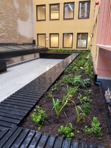 Myndighetene har stilt krav om at takene skal kunne takle en 20-års nedbørepisode, det vil si at de skal kunne ta unna et påslipp på én liter vann pr. sekund. Dessuten må takene selvsagt tåle vekten av folk, vann, vegetasjon og installasjoner. Takene i 2. og 9. etasje skal gi gode opplevelser for opphold, og alle takene skal være fine å se på fra de omkringliggende bygningene. Takene sto ferdig anlagt i høst, og landskapsarkitekt Janicke Ramfjord Egeberg hos Asplan Viak presenterte den blå-grønne delen av prosjektet under et webinar 20. oktober.