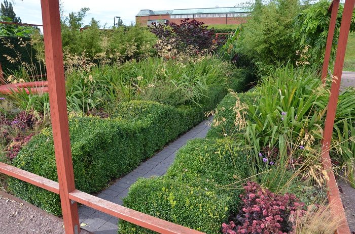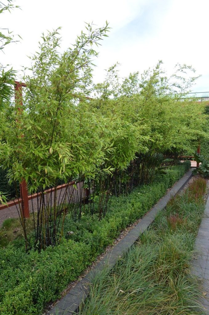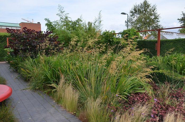 Allium sphaerocephalon (kuleløk), Aristolochia manshuriensis (koreapipeurt), Asplenium scolopendrium (hjortetunge), Buxus sempervirens (buksbom), Cercis canadensis ‘Forest Pansy’ (rødbladet amerikajudastre), Euphorbia cyparissias ‘Fens Ruby’ (rødbladet sypressvortemelk), Festuca scoparia (bjørnesvingel), Hylotelephium telephium ‘Purple Emperor’ (rødbladet evigbergknapp), Imperata cylindrica ‘Red Baron’ (bomullsgras), Iris foetidissima (koralliris), Juncus effusus (lyssiv), Knautia macedonica (gresk rødknapp), Luzula pilosa ‘Igel’ (hårfrytle), Ophiopogon planiscapus ‘Nigrescens’ og ‘Black Beard’ (svart ormeskjegg), Parthenocissus tricuspidata ’Purpurea’ (rødbladet rådhusvillvin), Phyllostachys aureosulcata ‘Aureocaulis’ (gulstammet bambus), Stipa tenuissima (mexicofjørgras) og Wisteria floribunda ‘Shiro-noda’ (hvitblomstret japanblåregn).