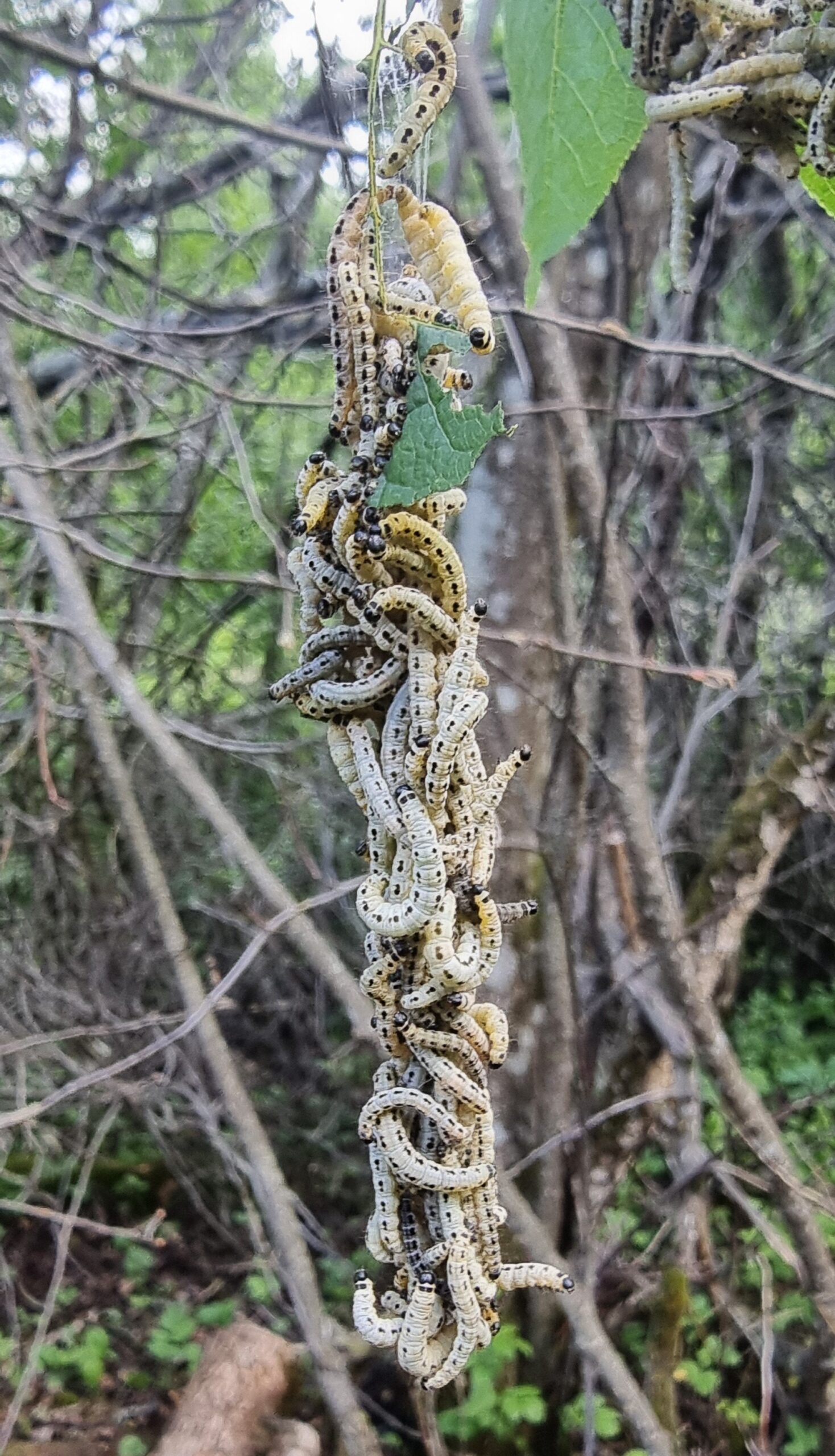 Heggspinnmøll (Yponomeuta evonymella)er en om lag to centimeter lang sommerfugl med svartprikkete, hvite forvinger. De voksne sommerfuglene gjør ikke så mye av seg, men de grågule larvene med svarte prikker kan, når det er mange nok av dem, gnage i seg alle bladene på store heggtrær på forsommeren. Larvene danner et felles spinn til beskyttelse mot å bli spist av fugler. Krona til heggtrærne kan i en periode være helt dominert av slike spinnsekker. Angrep av heggspinnmøll varierer mye fra år til år og fra sted til sted. I år er det betydelige angrep av arten flere steder på Østlandet. Heldigvis ser hegg ut til å være tilpasset angrepene, og nye skudd og blader bryter, slik at krona blir grønn igjen etter at larvene har forpuppet seg.