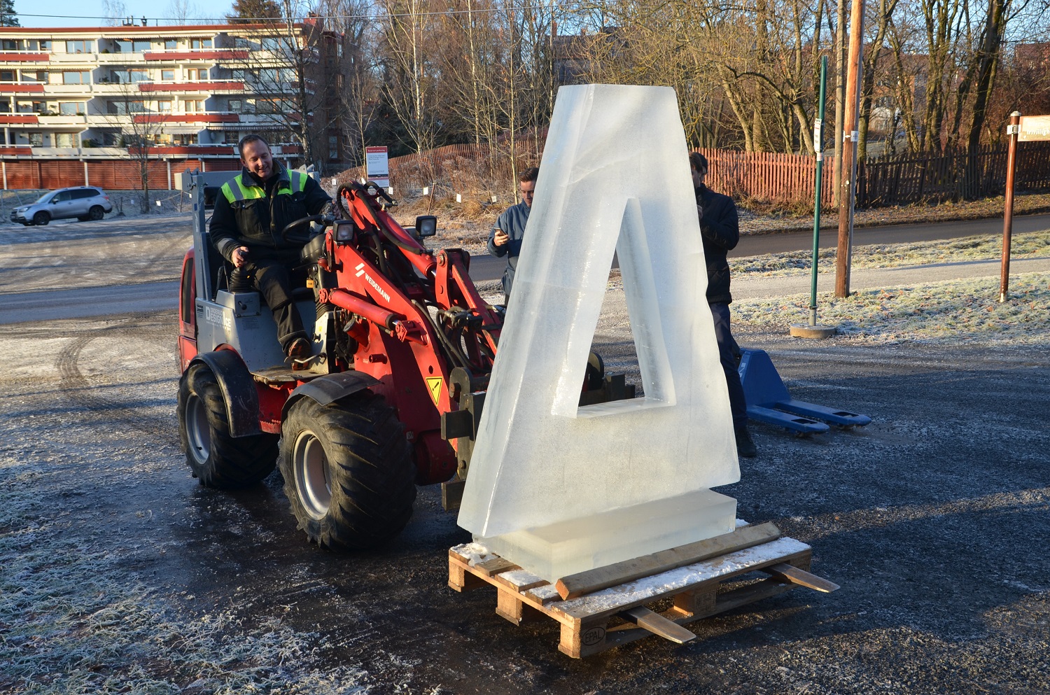 Thomas Orderud i Trøgstad-firmaet DesignIce Norway leverte for annet år på rad en isskulptur utformet som firmalogoen til julebordet i et firma på Skøyen i Oslo. Den mer enn 200 kilo tunge skulpturen skulle plasseres på firmaets terrasse i fjerde etasje. Heldigvis var heis, dører og inngangsparti nøyaktig oppmålt på forhånd. Med millimeters klaring kom skulpturen på plass et par dager før årets julebord i midten av desember.