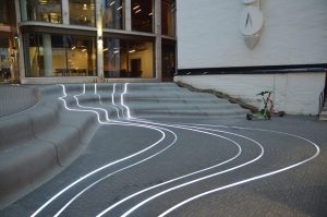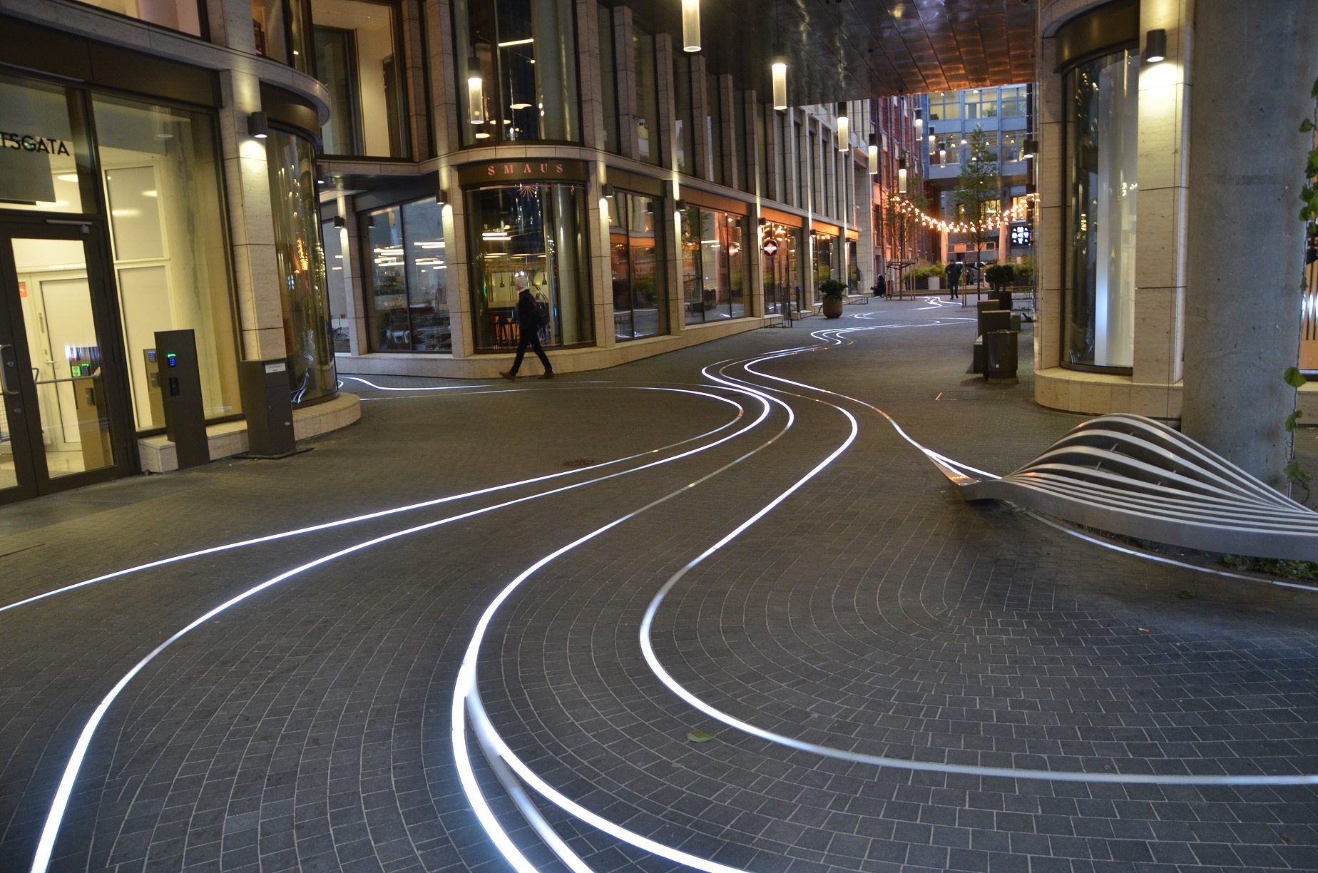 Smuget mellom Pilestredet, Universitetsgata og Kristian IVs gate i Oslo er verdt et besøk idet det mørkner. Innfelt belysning danner et «elveløp» i et sammenhengende bygulv.