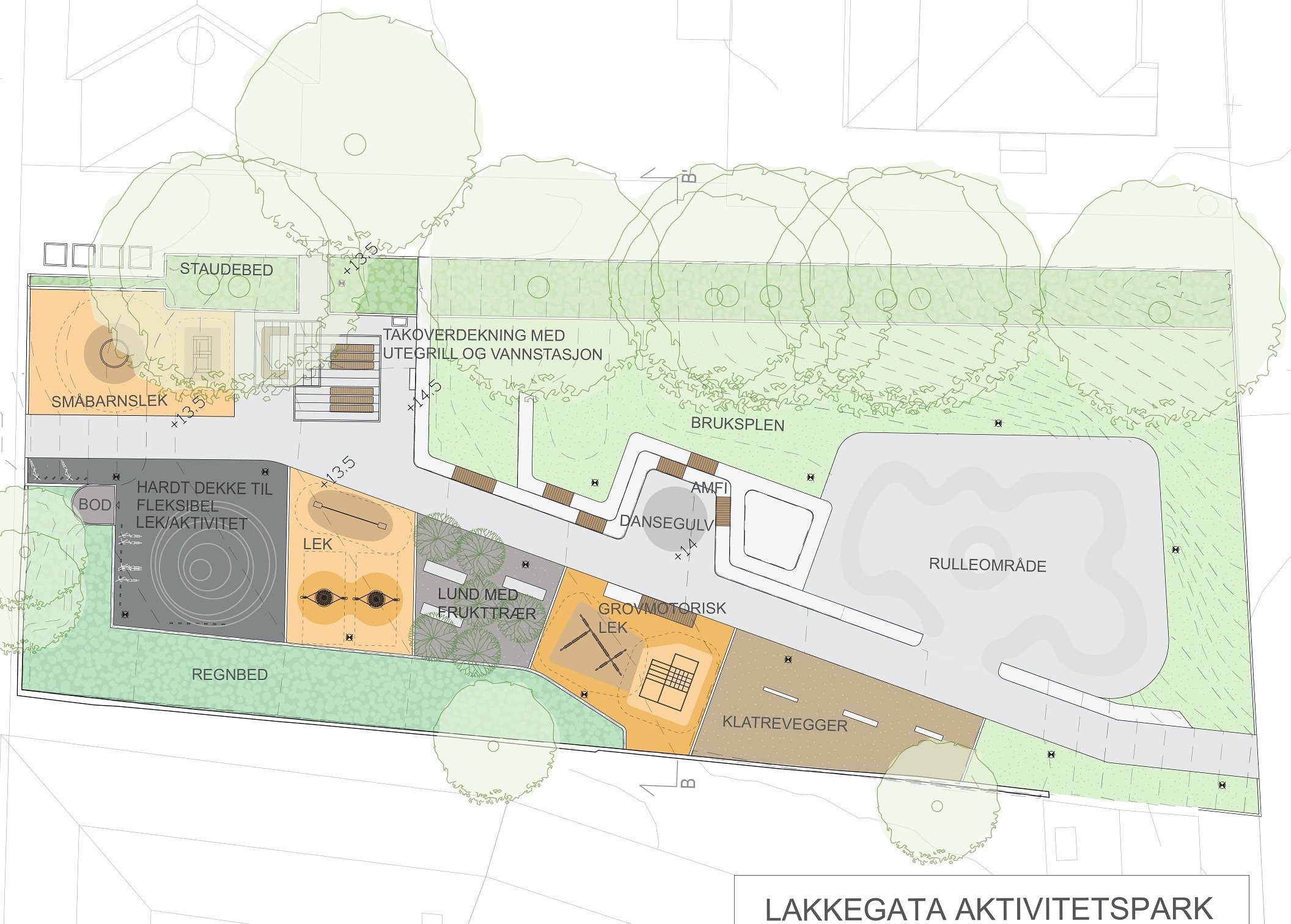 Aktivitetsparken ligger på Sofienberg, ikke langt fra Botanisk hage. «Vi har tegnet Lakkegata aktivitetspark som en fleksibel og dynamisk park. Parken ligger skjermet med skolebyggene og Gråbeingården som en trygg ramme rundt. Her er det lagt til rette for et godt lokalklima, hvor elevene kan leke i gode og trygge omgivelser på tilrettelagte lekeplasser, eller bruke hele plassen aktivt i leken,» skriver landskapsarkitekt Kristine Austad Myklebust i Asplan Viak.