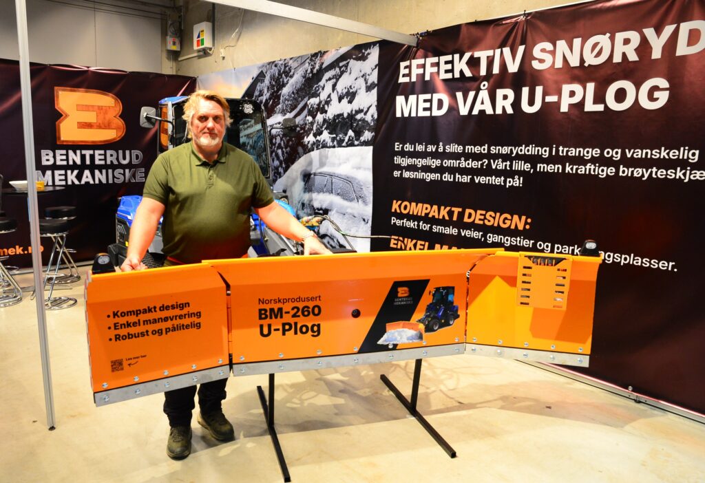 Benterud Mekaniske var blant utstillerne på årets Park og Anleggsmesse. Bedriften viste fram denne U-plogen for små redskapsbærere. Den er helt ny og ble presentert for første gang på Dyrsku’n tidligere i år. Det dreier seg om en norskprodusert snøplog med hydraulisk skråstilling og hydrauliske vinger. Den totale bredden er på 2,6 meter, hvorav midtseksjonen utgjør 1,3 meter. Høyden er 65 cm, og den veier 230 kg. Vingene kan vris begge veier: – Denne snøplogen så dagens lys fordi vi selv hadde et behov. Vi hadde en liten redskapsbærer som vi ønsket å bruke til å brøyte snø med på litt trange plasser, så vi undersøkte markedet for å finne en egnet plog, men uten å lykkes. Det fantes rett og slett ikke snøploger som egnet seg for vår bruk, så da lagde vi en selv. Resultatet ser du her, og ut ifra responsen på Dyrsku’n og her på messen ser det ut til at det er mange som har samme behov som oss, mener Øyvind Braseth fra Benterud Mekaniske.