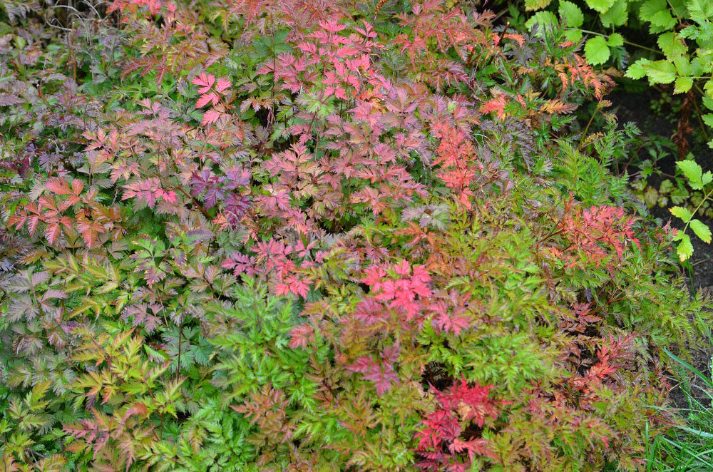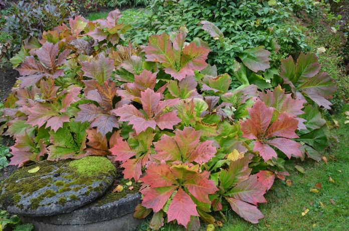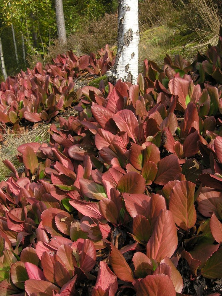 Bronseblad (Rodgersia sp.) trives best under skyggefulle forhold. Tidlig i sesongen er bladene bronsefarget, seinere grønne, men i en lang, mild høst får de innslag av røde farger.