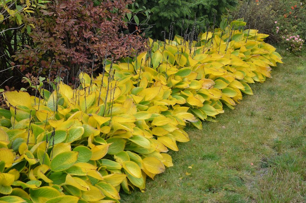 Bladlilje (Hosta sp.) har blader som blir ødelagt ved første nattefrost. Når frostnettene lar vente på seg, får soleksponerte blader nesten selvlysende, gul farge.Silkekinagras (Miscanthus sinensis) er et eksempel på at også noen prydgras kan gi farge til høstukene.Koreaskjegg (Aruncus aethusifolius) får bra høstfarge de fleste år, forutsatt at plantene står soleksponert.Bergblomst (Bergenia sp.) beholder bladene gjennom vinteren, men de skifter vanligvis farge som en tilpasning til overvintring.Gillenia (Gillenia trifoliata) er et staudeslag som årvisst demonstrerer at også stauder kan få flott høstfarge når plantene står lyst.