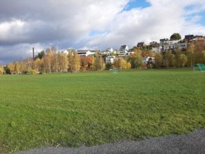 Jevn, vekstkraftig plen uten stående vann på det rehabiliterte området av Strandpromenaden etter nedbørsperioden. Foto 4. oktober 2021: Trond Knapp Haraldsen