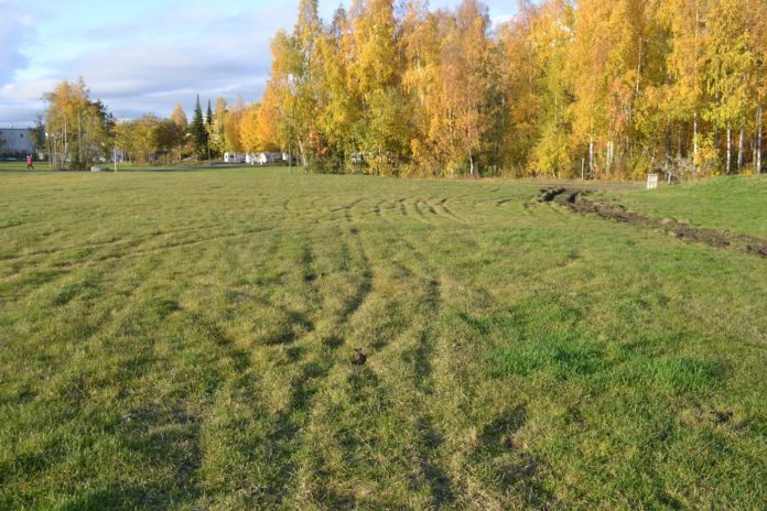 Det var tett med kjørespor i graset på friområdet Strandpromenaden på Lillehammer. Foto 14. oktober 2019: Trond Knapp Haraldsen