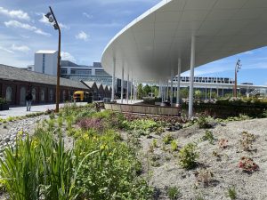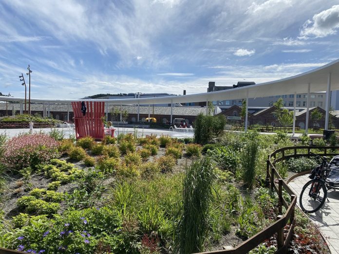 Det bærende elementet for overvannsdisponeringen er at all nedbør skal infiltreres i grunnen og etter føringene fra kommuneplanen i stor grad handteres på overflaten. Trær og regnbed bidrar til økt biodiversitet, bedrer luftkvaliteten, gir trivsel og sirkulærdisponerer vann. Mer enn en tredjedel av den tidligere parkeringsplassen er beplantet. Det står trær overalt, både i parken og i kollektivterminalen: – Dersom noen fotograferer området ovenfra om noen år, vil hele Ruten se grønn ut. Da har trekronene bredt seg, beskriver prosjektleder Arne Jørgensen, som er klimasjef i Sandnes kommune. – Vi har laget et byrom med mange trær. Under granitthellene har trerøttene fri passasje gjennom biokull og kompostjord, og røttene har hele Ruten til sin disposisjon.