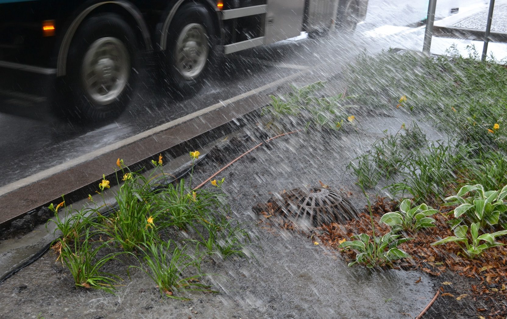 Sprut fra vogntog og andre tyngre kjøretøyer i regnværsperioder nådde langt inn i regnbedet og ga stor erosjon når plantene hadde gått ut. Foto: Trond Knapp Haraldsen