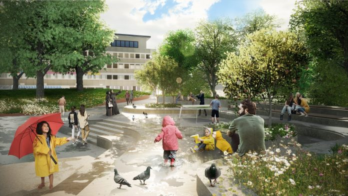 Landskapsplanen: Fordrøying gjennom dammene samt nedgravd magasin under lekeområdet vil ta unna overvannet ved nedbør, men i ekstreme tilfeller vil det bli en kontrollert oversvømmelse av arenaen og de sentrale områdene i parken. Det skal redusere risikoen for skade på bygningsmasse og kritisk infrastruktur i Lørenskog sentrum. Illustrasjon: Bjørbekk & Lindheim