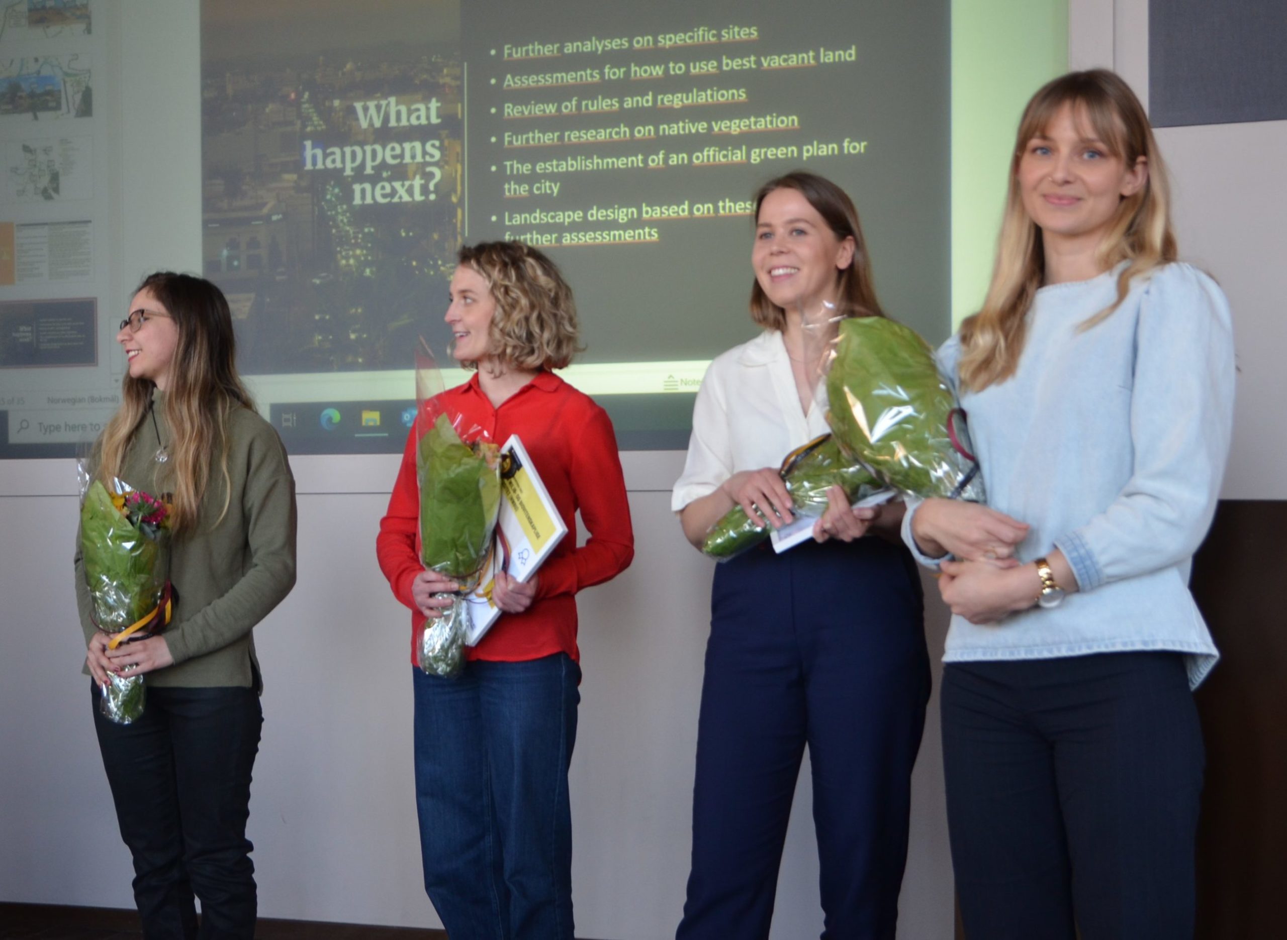 Under et arrangement 31. mars ble de tre masteroppgavene som slapp gjennom nåløyet til NMBUs interne fagjury, presentert. Statsbyggs egen jury hadde vurdert de svært gode oppgavene og fikk en vanskelig oppgave. Men etter presentasjonene kunne Statsbyggs representant, overarkitekt Andreas Nilsen, dele ut prisen til landskapsarkitektene Elise Buan og Johanne Helvik.