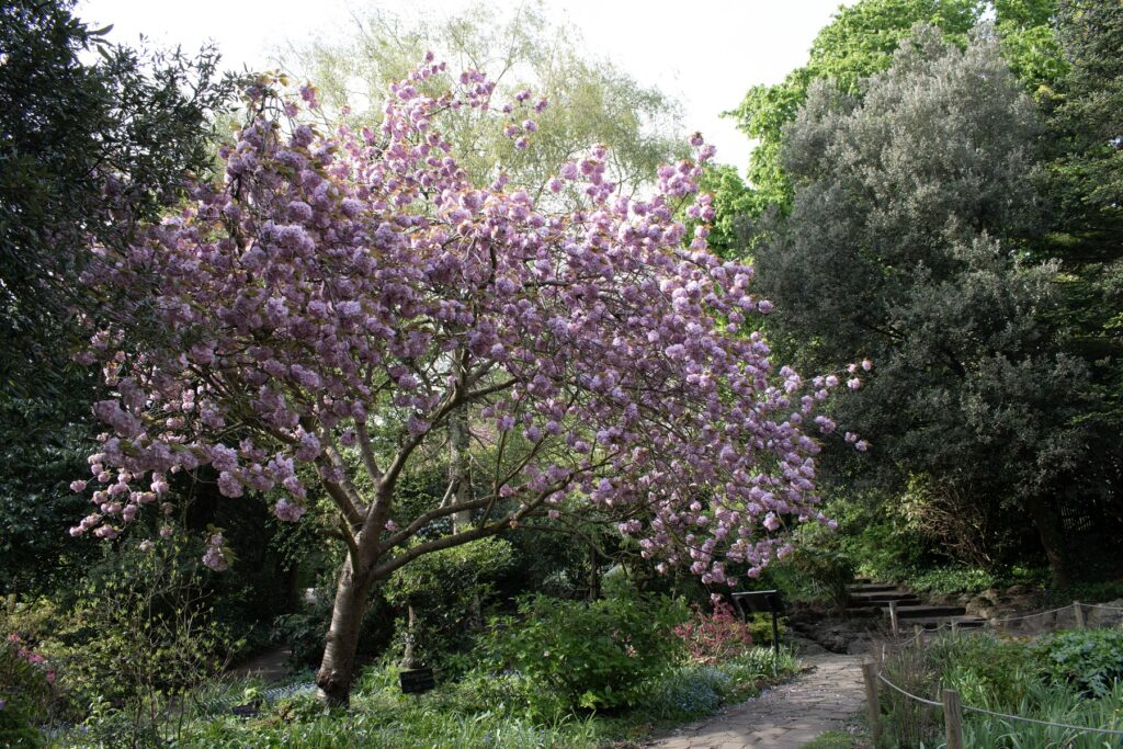 Et vakkert japansk kirsebærtre står i enden av The Rock Garden. Det var vanlig å inkludere noen asiatiske elementer i de edvardianske hagene. Foto: Hilde Kristin Grønlund