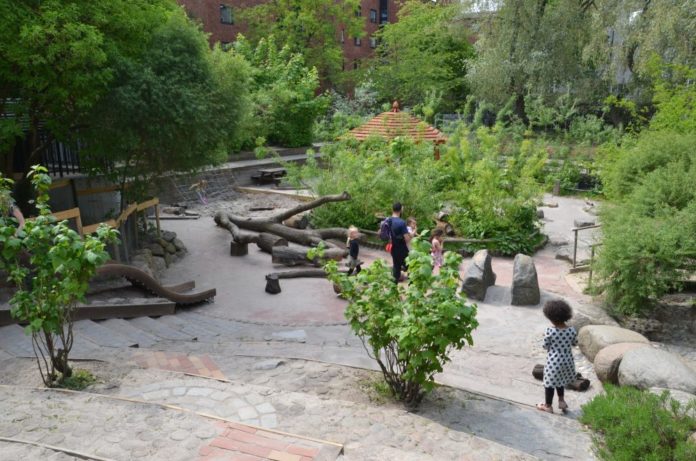 Den innholdsrike lekeplassen er i hovedsak basert på naturmaterialer.