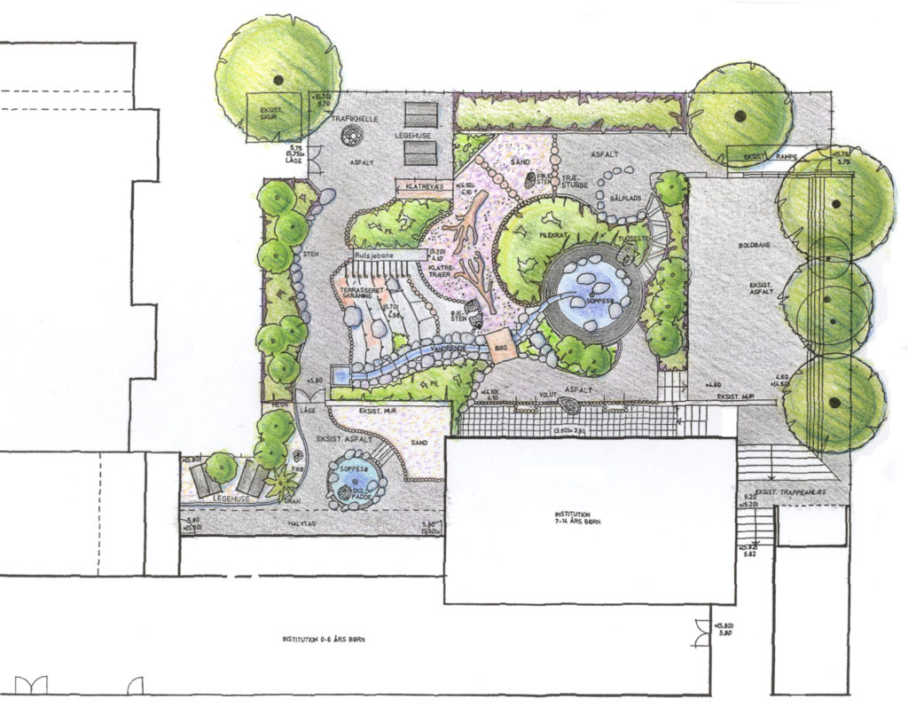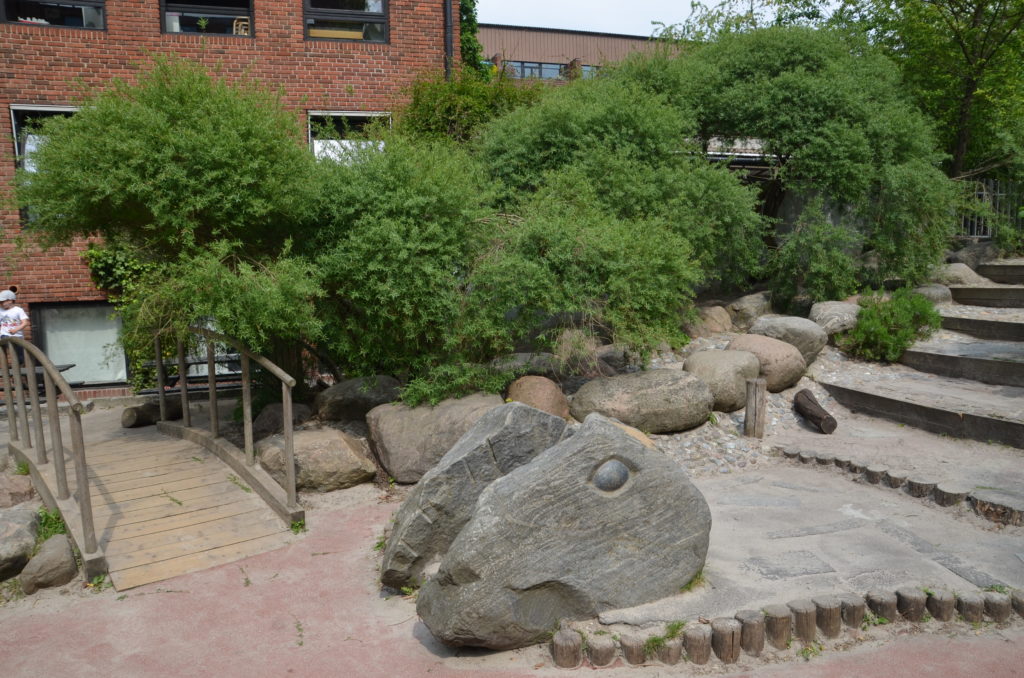 Den plantede vegetasjonen består for en stor del av ulike slag pil – robuste planter som tåler barns lek. Etter tyve år danner rødpil ‘Nana’ små rom bak «grønne forheng». Den kløyvde «Øjesten» i forgrunnen.