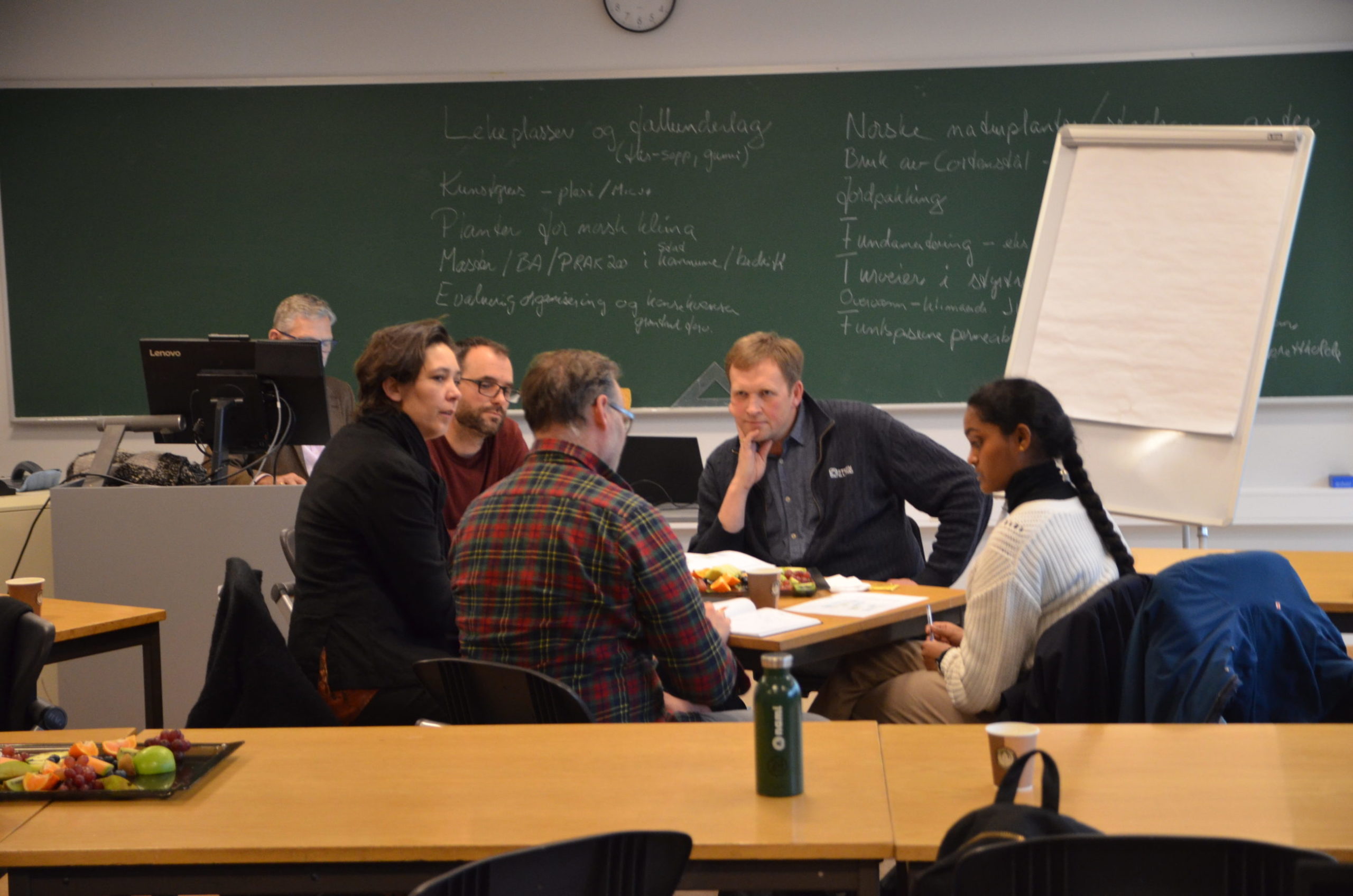 Under bransjetreffet ble det gjennomført gruppearbeid. Her diskuterer f.v. Line Løvstad Nordbye fra Bjørbekk & Lindheim, Karsten T. Raddatz fra Hageform, Bjørn Aakerholt fra Steen & Lund og LING-student Beulah Kaneshalingam de tildelte oppgavene. Med ryggen til: Tørres Rasmussen fra LINK Landskap og styreleder i Norsk Trepleieforum.